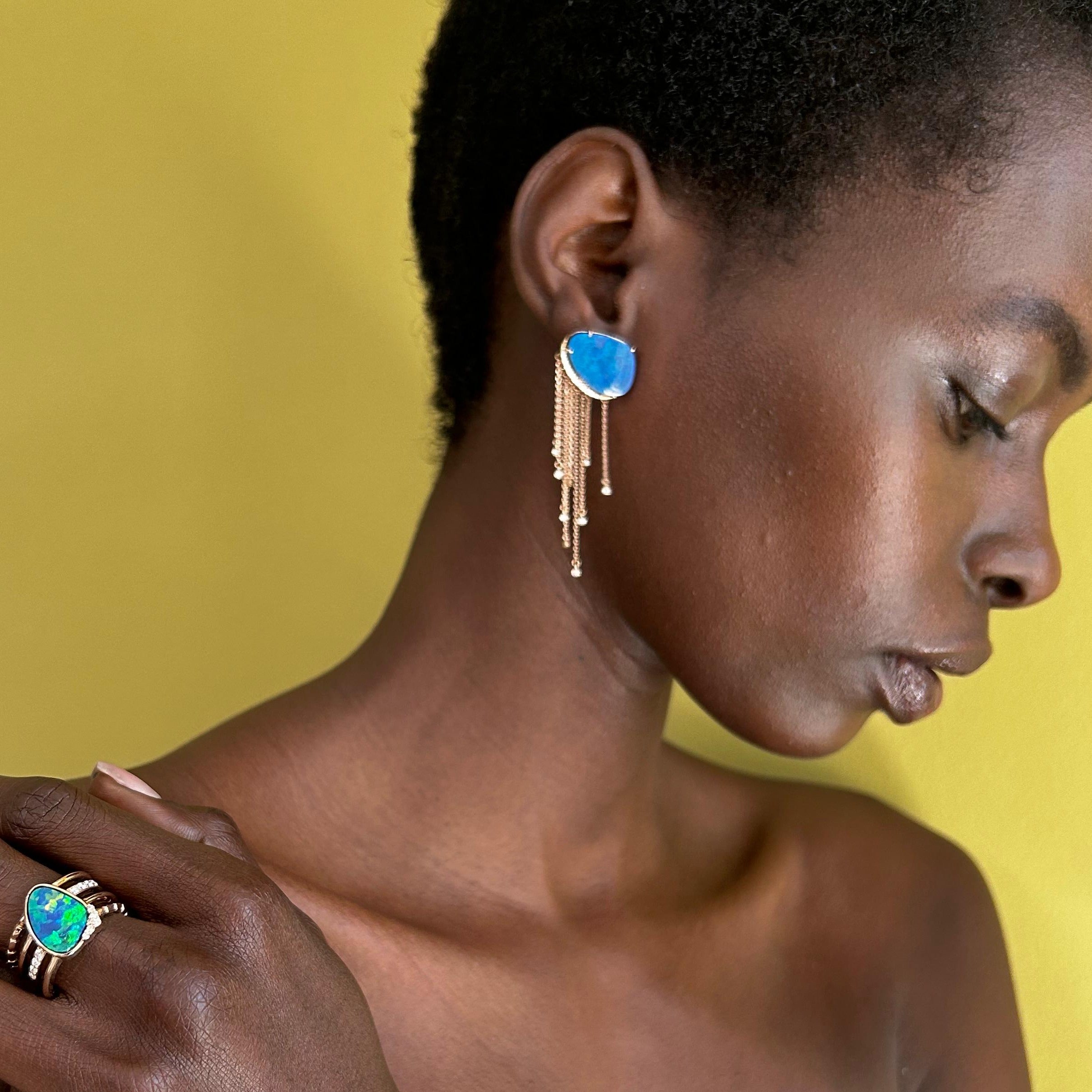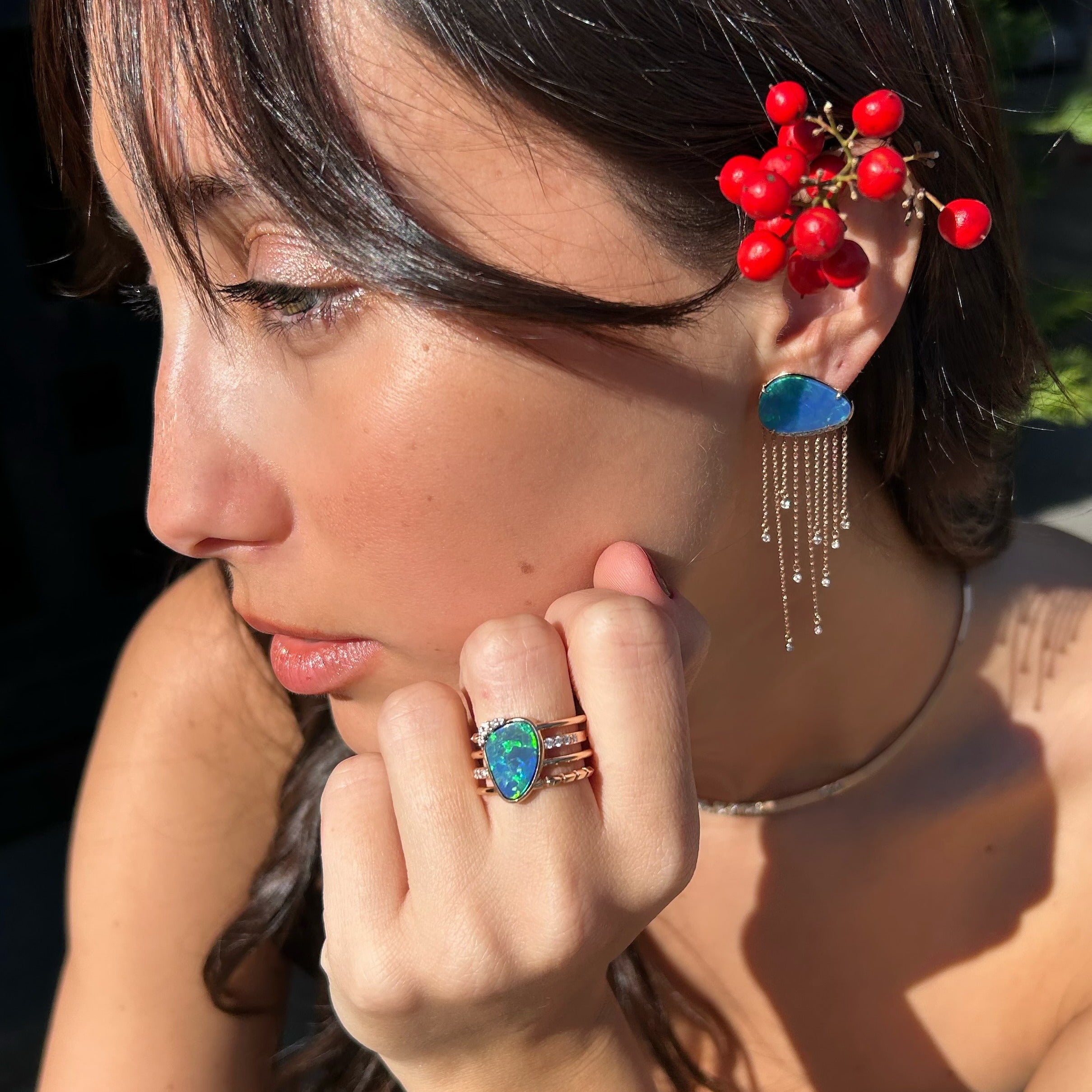 The Treasures of the Sea Collection is inspired by the water element which represents the treasures and the natural stones hidden in the depths of the sea. Selda created this collection during her life in the Aegean, where she was born, to show the women’s sense of freedom with the endless journey we find the Turquoise waters . We use Australian Opals which are believed to bring good fortune, peace, joy, and wealth to the wearer.