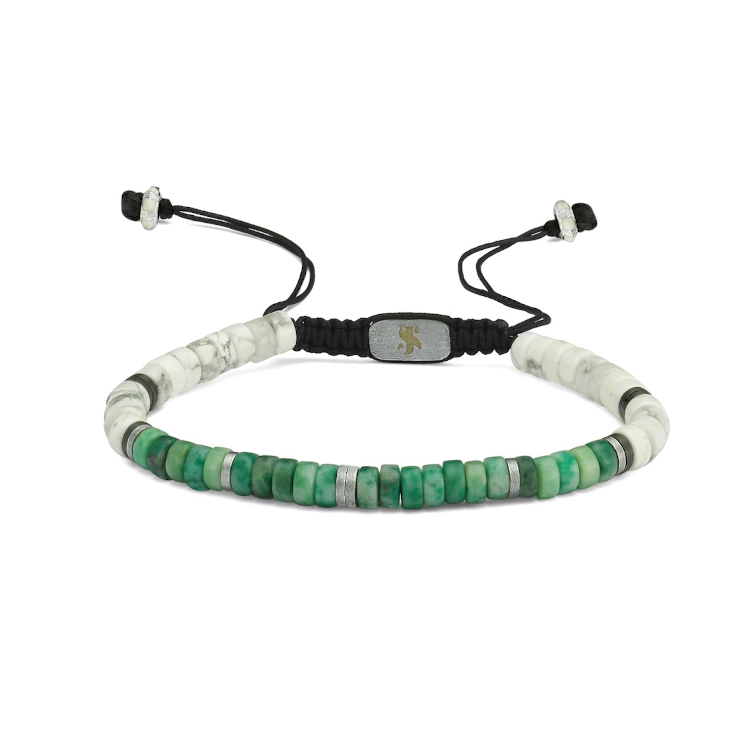 The mix of Howlite&Jade stones is combined with sterling silver Charms to create a sporty and stylish bracelet.