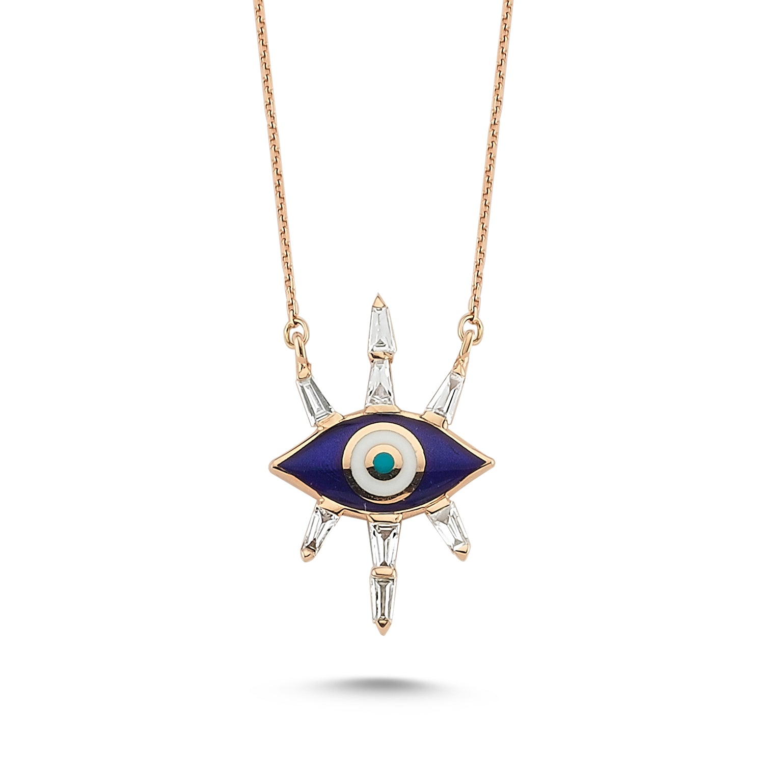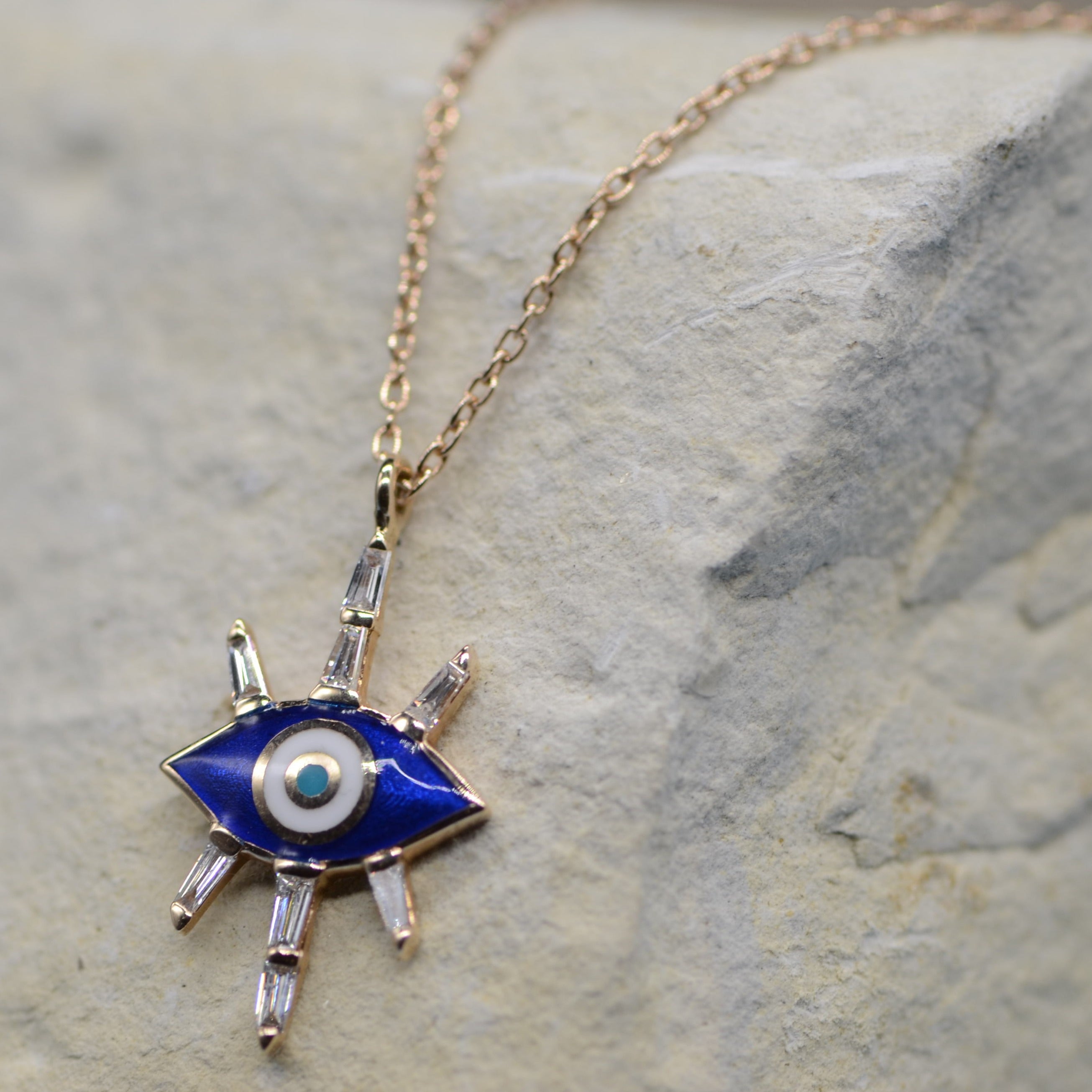 Evil Eye Necklace with Navy Blue Enamel & Tapered Diamond