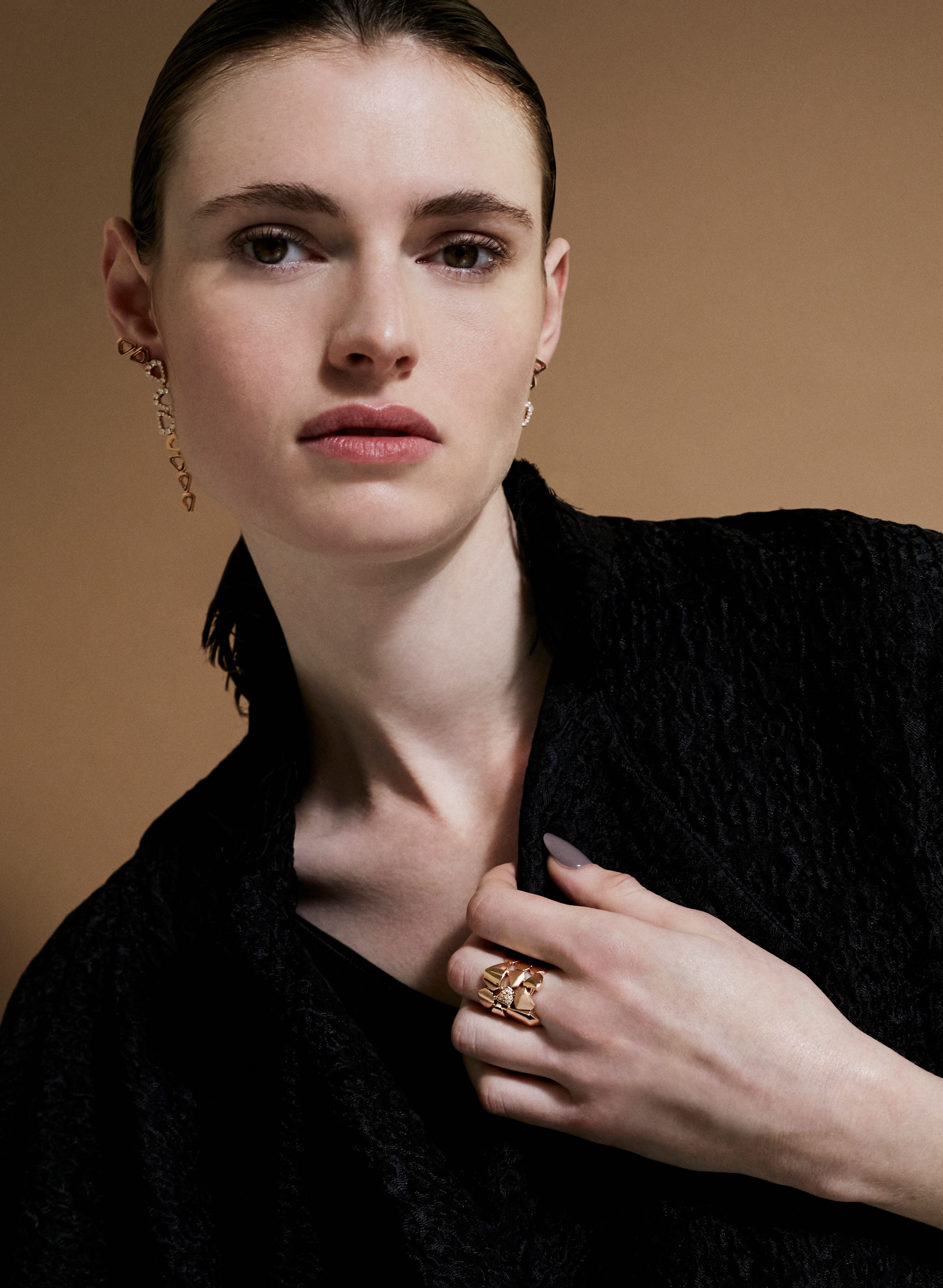 “G A I A” collection embodies a harmonious blend of special elements such as; texture, special Cut Citrine, Reverse Set Diamonds, satin finish and Black rodium, simultaneously presenting an abstract dragon module as the centrepiece, symbolizing courage, wisdom, and power which is Selda Jewellery’s brand DNA.