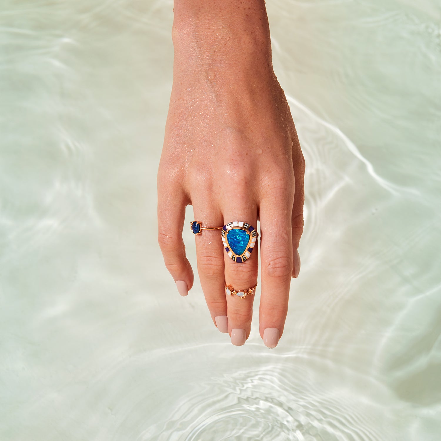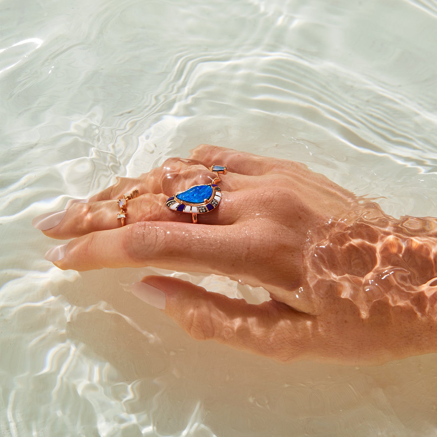The Treasures of the Sea Collection is inspired by the water element which represents the treasures and the natural stones hidden in the depths of the sea. Selda created this collection during her life in the Aegean, where she was born, to show the women's sense of freedom with the endless journey we find the Turquoise waters . We use Australian Opals which are believed to bring good fortune, peace, joy, and wealth to the wearer.